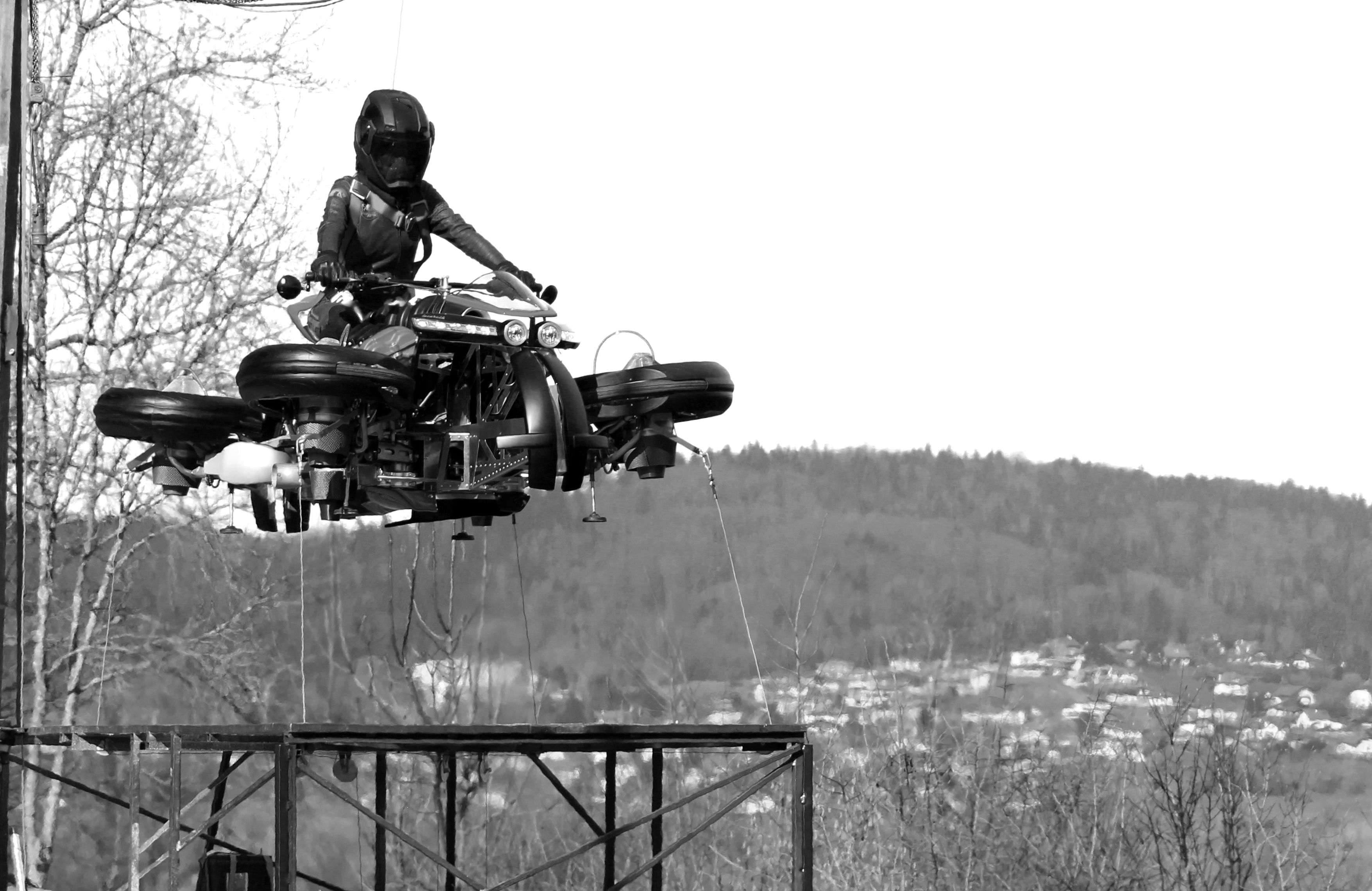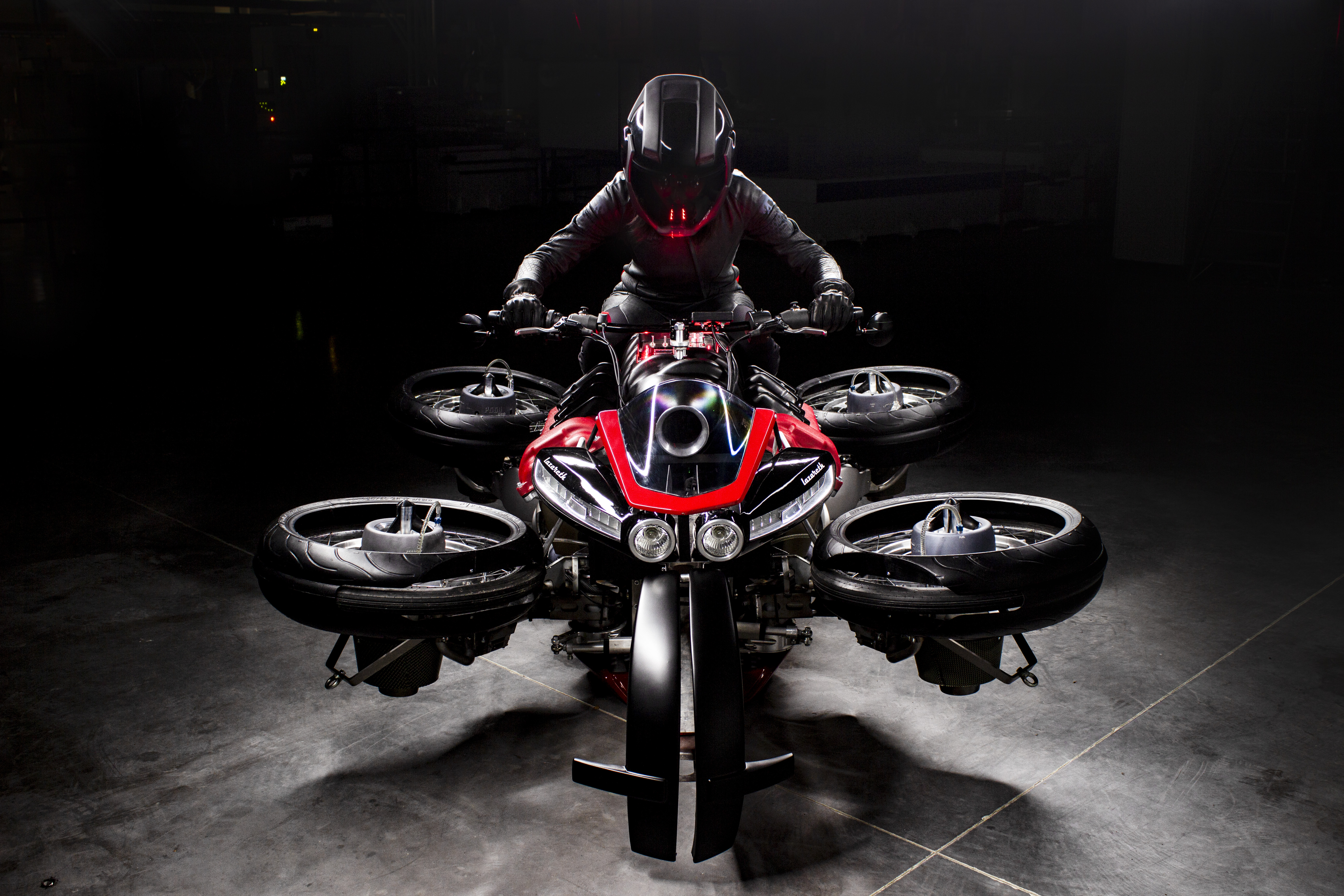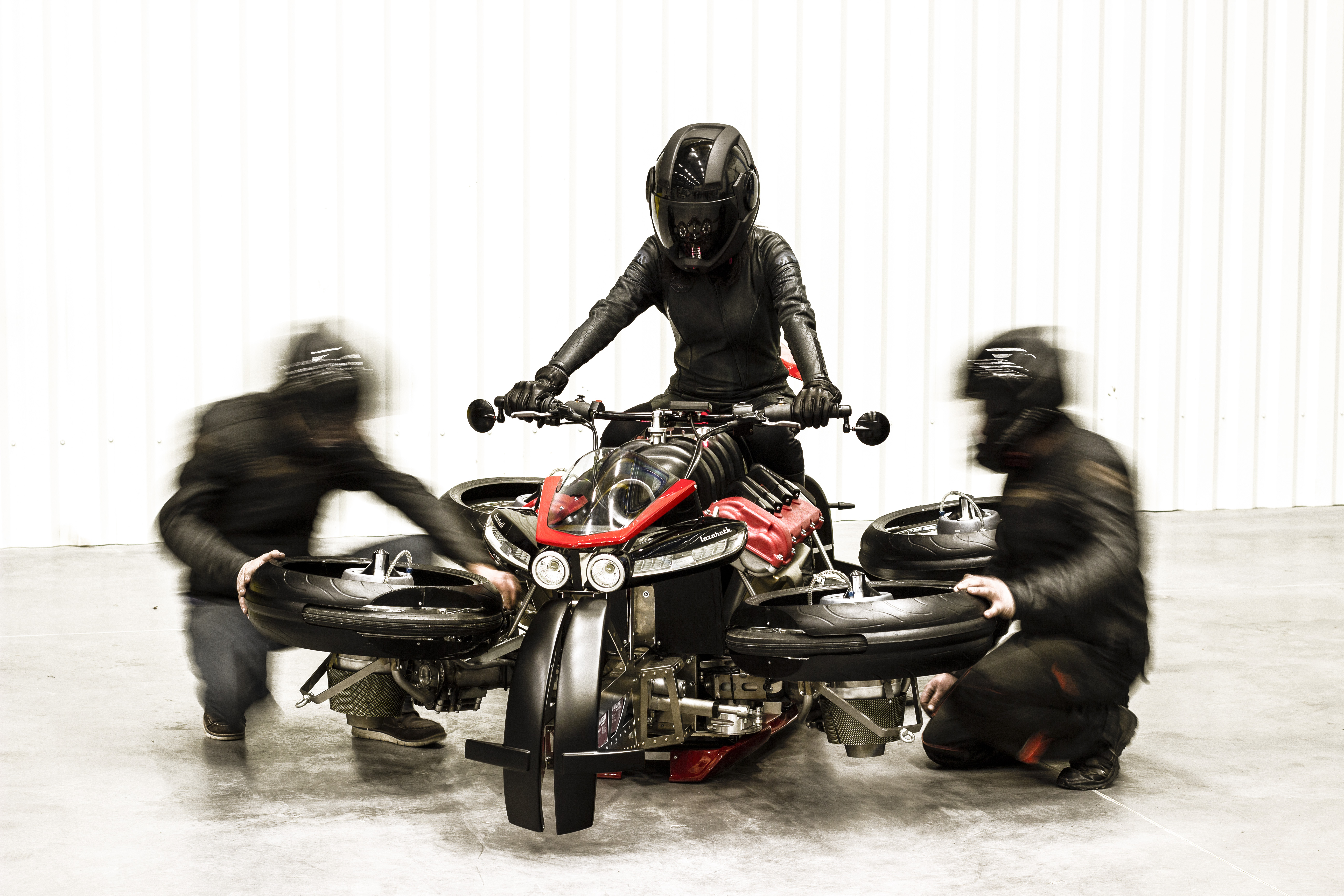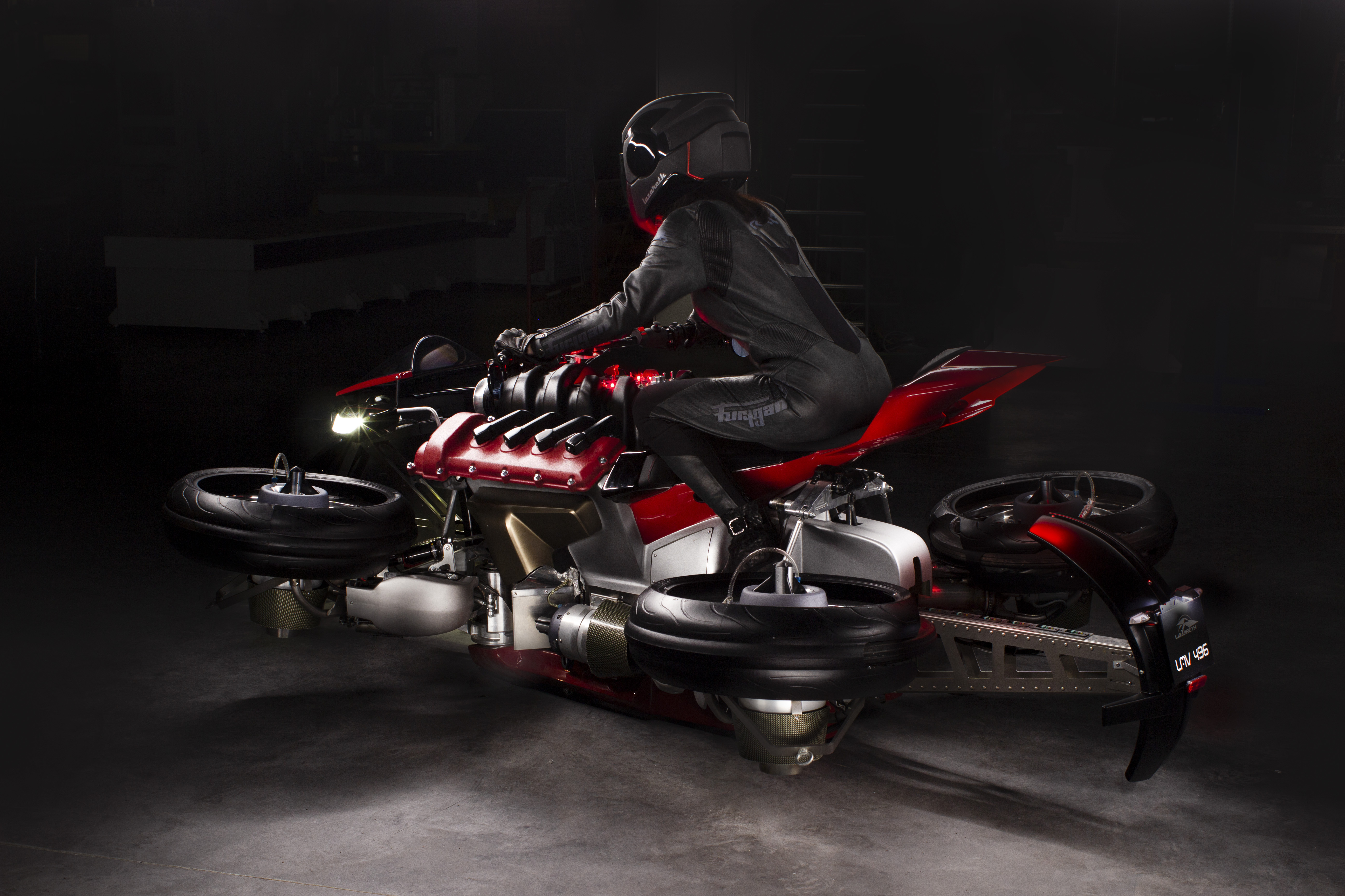 The first ever flying motorcycle has been unveiled by French manufacturer, Lazareth. Built by the famous French craftsman and innovator, Ludovic Lazareth, the machine has the code name: LMV 496. And the rider stays protected and stylish in a custom-made Furygan leather suit.